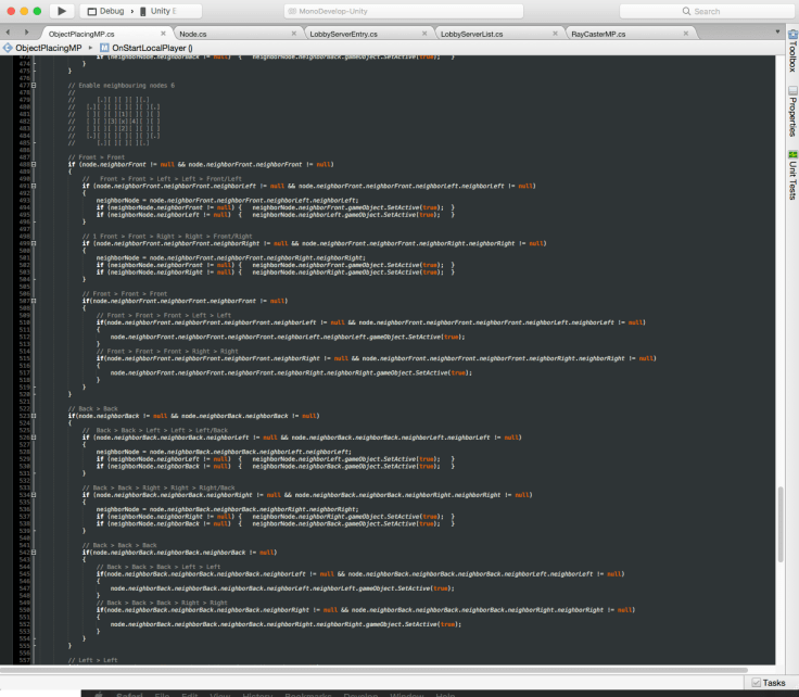 A little bit of the code I’ve written to enable neighbouring nodes when a player build a wall or base. By giving the nodes references to their neighbouring nodes I can ‘travel’ from neighbor to neighbor to set them active. I immediately thought of a better way to do this right after I was done with this method, but it works for now I will implement the better solution a little later.