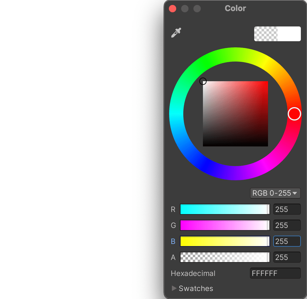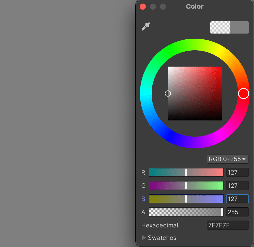 In sommige programma’s kun je kleuren ook makkelijker instellen met een getal tussen de 0 en 1. Dan is (0,0,0) zwart, (1, 1, 1) wit en (0.5, 0.5, 0.5) grijs: