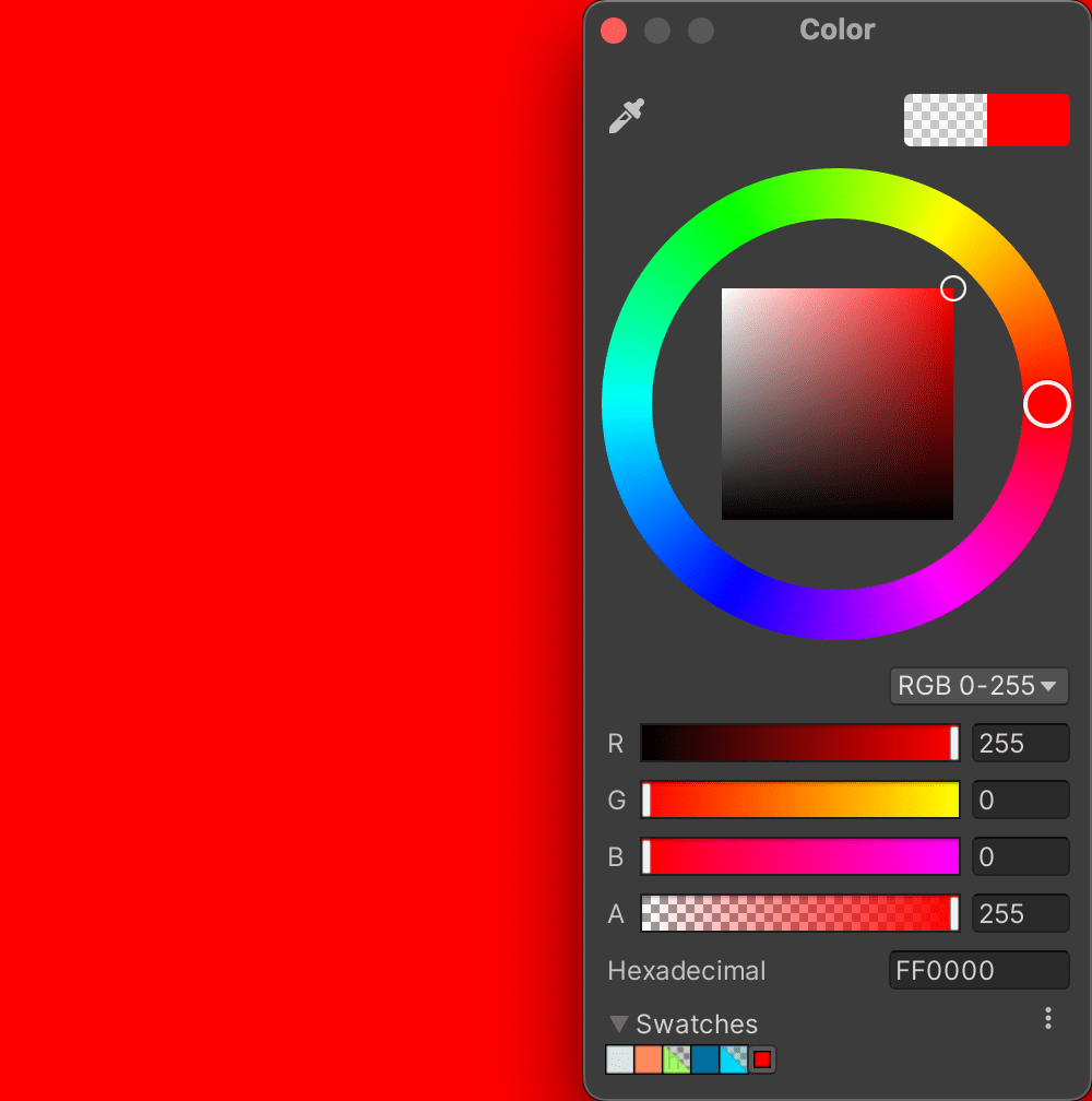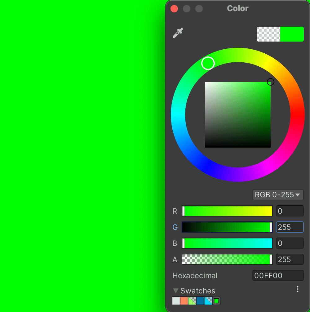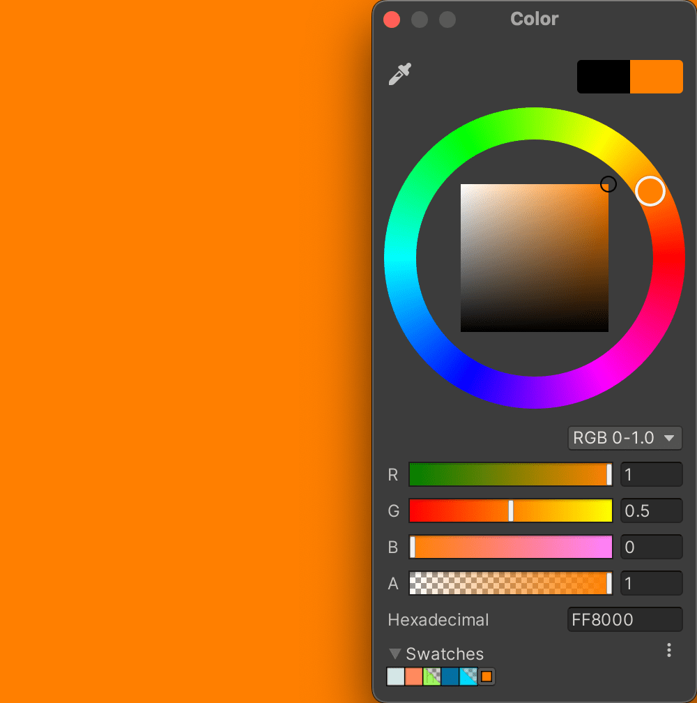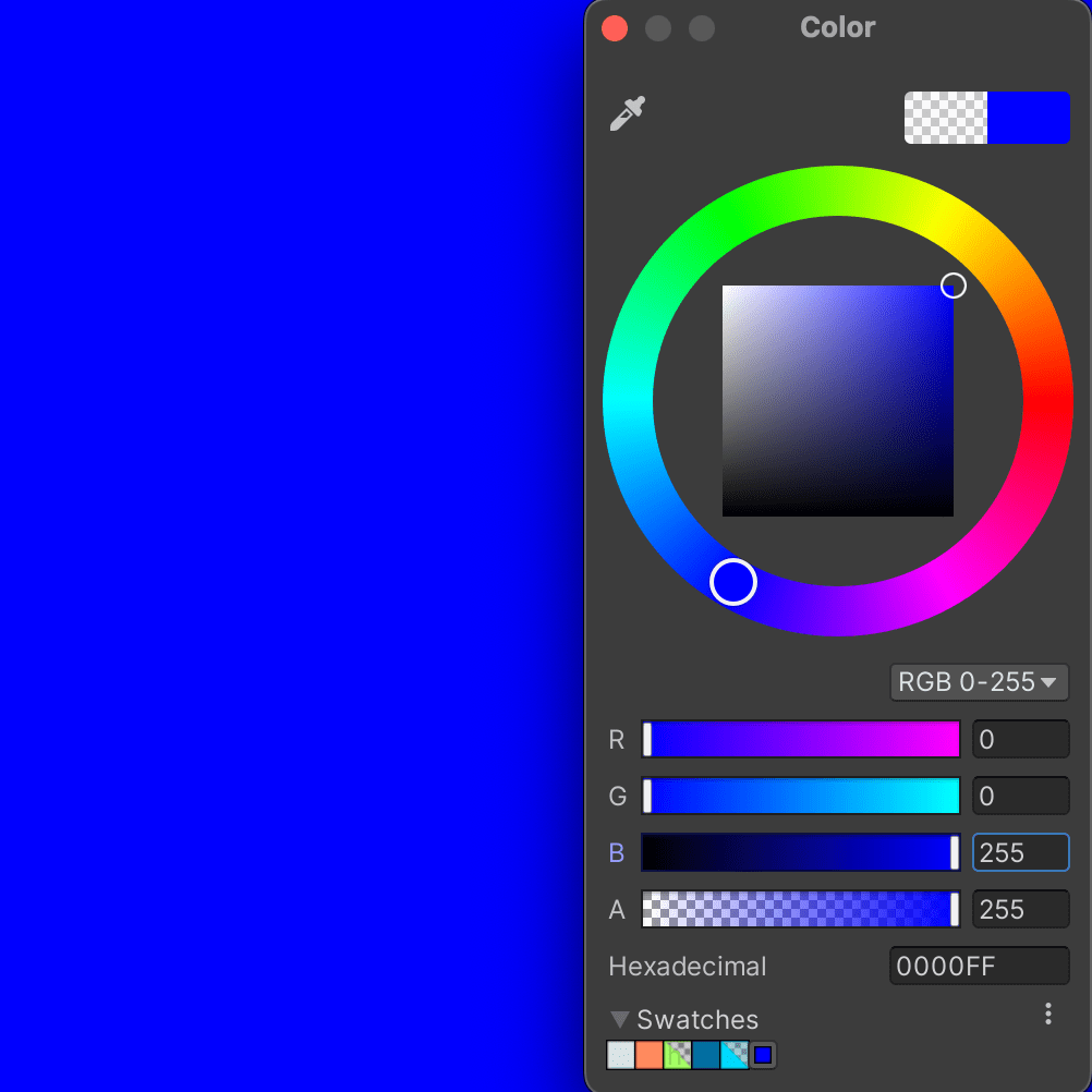 Hieronder zie je een voorbeeld van een color picker in het programma Unity, waarmee een kleur gekozen kan worden. De meeste programma’s zoals Photoshop, mail programma’s, tekstverwerkers etcetera gebruiken een color picker venster dat er ongeveer hetzelfde uitziet: