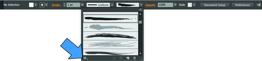 Om de keuze te krijgen uit veel meer penselen dan welke er standaard in je document zitten klik je op het ‘Brush Libraries Menu’ knopje links onderin de lijst: