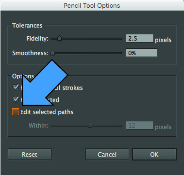 !Let op!: Het bewerken van geselecteerde lijnen met de Pencil Tool werkt alleen als de optie hiervoor is ingeschakeld.