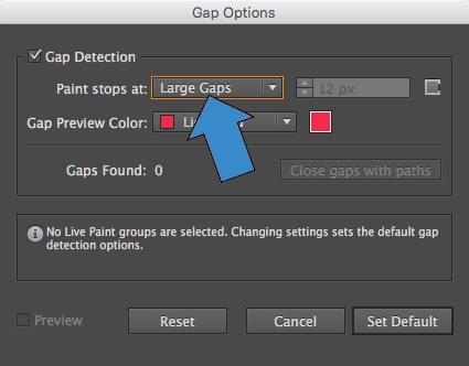 Je kunt in plaats van alle lijntjes langer te maken ook de toegestane ruimte tussen lijnen instellen. Klik in de Menu Balk op ‘Object > Actieve Verf > Tussenruimte opties’ en vergroot het aantal pixels naar bijvoorbeeld 12:
