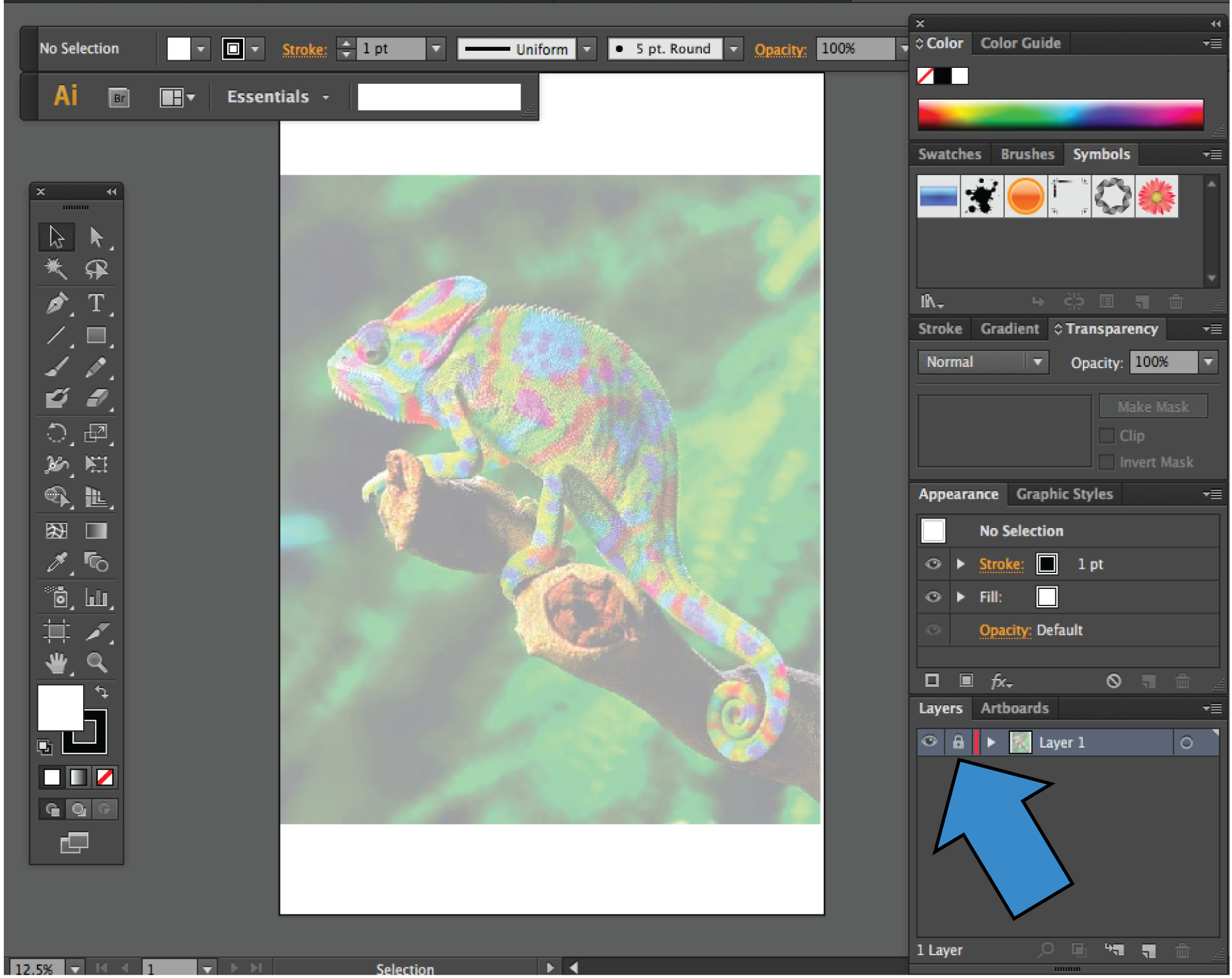 Nadat je de Opacity hebt verlaagd kun je de foto in het lagen paneel op slot zetten door links naast het oogje voor het laagje te klikken, zo voorkom je dat je de foto per ongeluk verplaatst of selecteert als je met de getekende lijnen bezig bent: