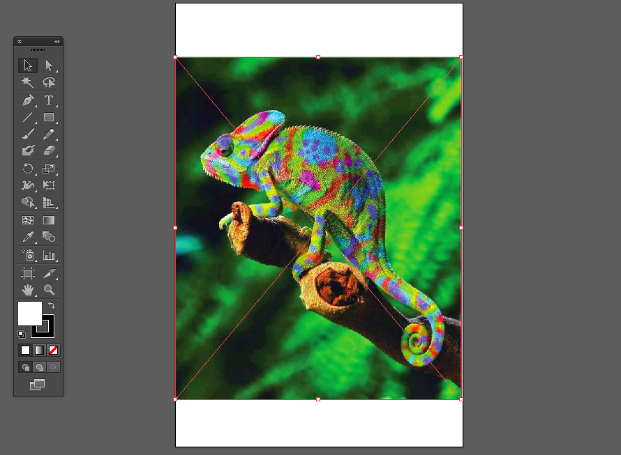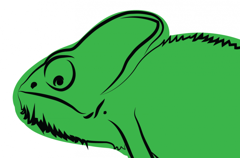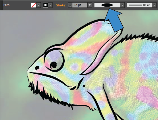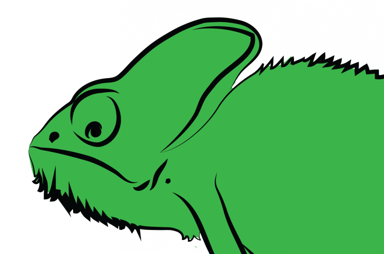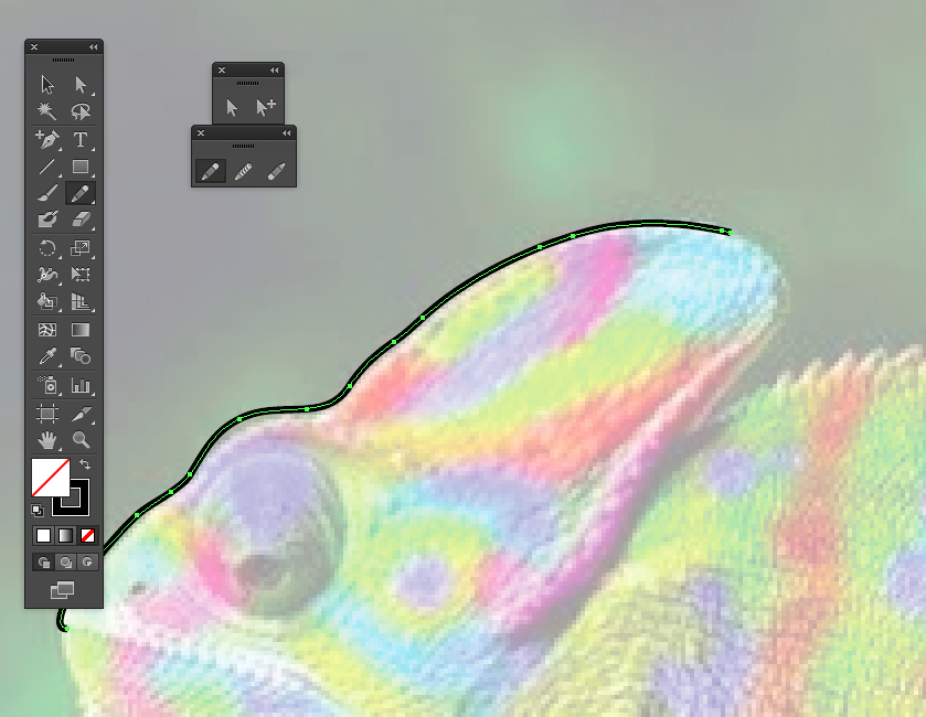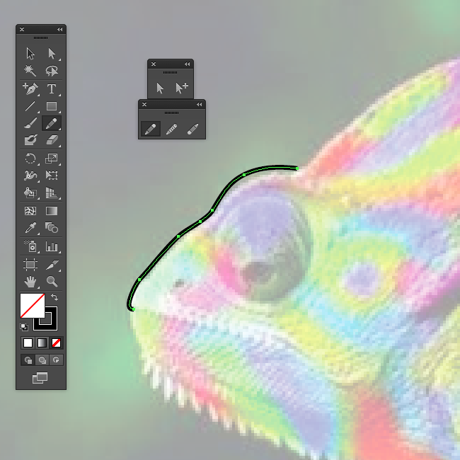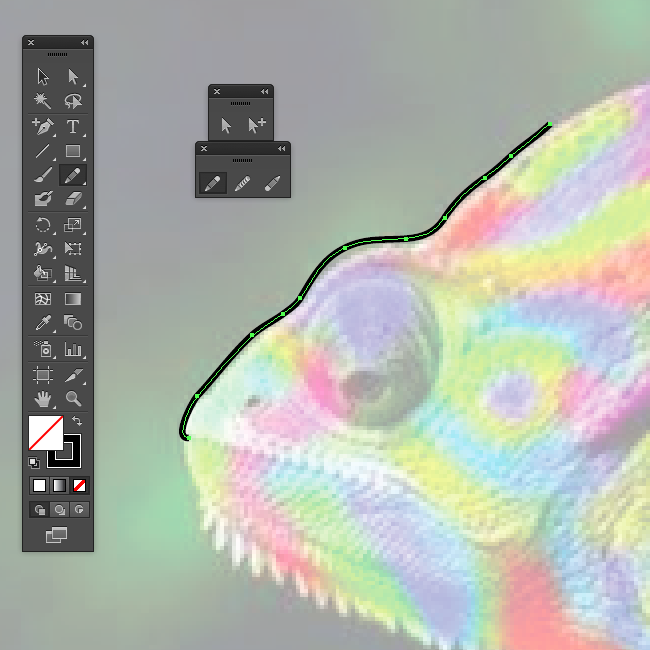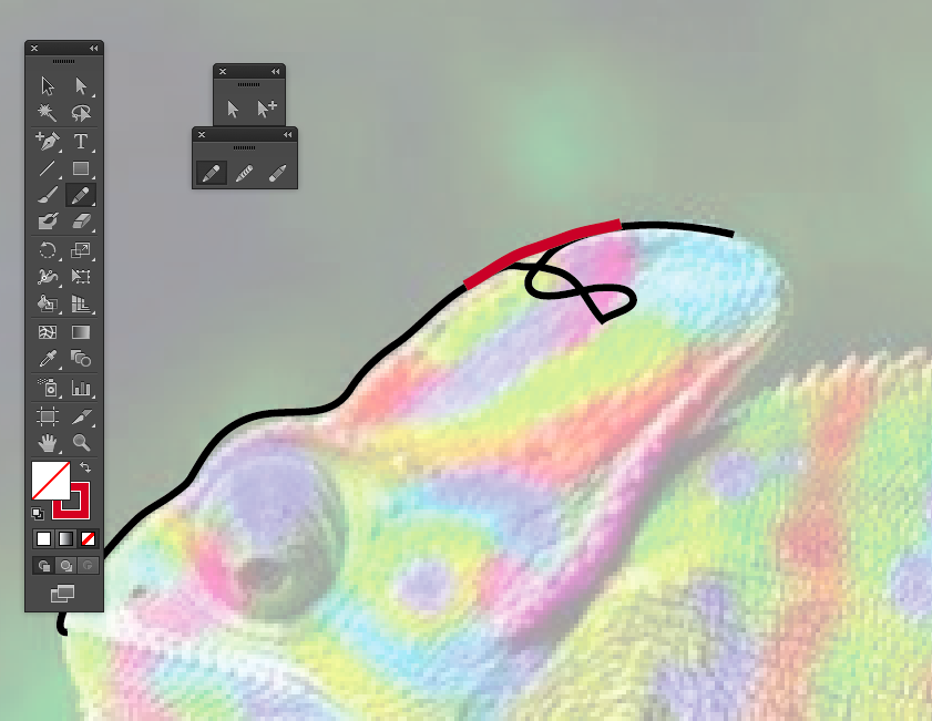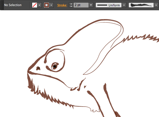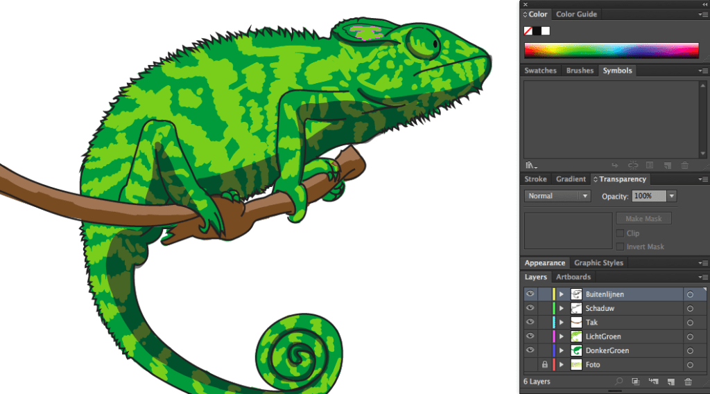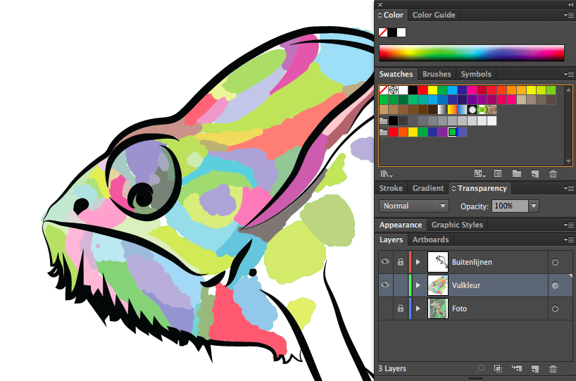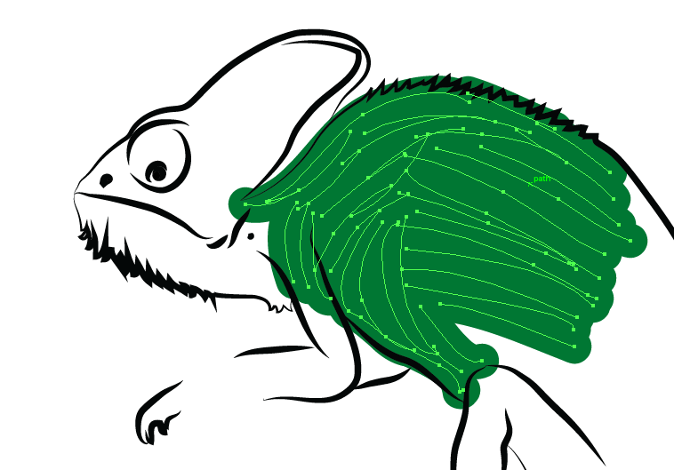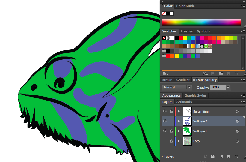 Voor een tekening die bestaat uit primitieve vormen, gesloten vormen of vlakjes, kun je simpelweg voor ieder vlak een vulkleur instellen in de Application Bar maar omdat een tekening zoals deze kameleon uit meerdere losse lijnen bestaat waarvan het begin niet aansluit op het eind, werkt dit niet zo goed. Dit komt doordat Illustrator als je een pad opvult dat niet gesloten is zelf een lijn trekt van het einde naar het begin: