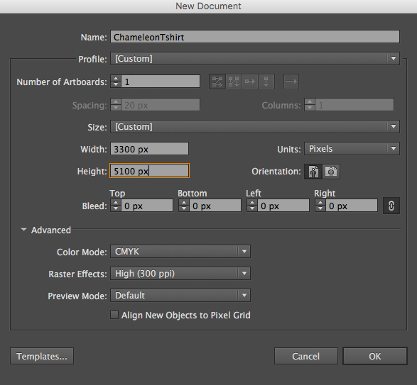 Een goed formaat voor een T-shirt design is 3300 pixels breed en 5100 hoog: