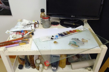 Het aller handigste om als palet te gebruiken vind ik een vrij grote glazen plaat omdat het gemakkelijk schoon te maken is, er is makkelijk op te mengen met paletmes of penseel en door de gladheid van glas spaar je ook de haren van je penselen tijdens het mengen. Nog een voordeel van glas is dat je er doorheen kunt kijken en je er dus gekleurd papier onder kunt leggen als je liever een andere kleur ondergrond dan wit of bruin wenst.:
