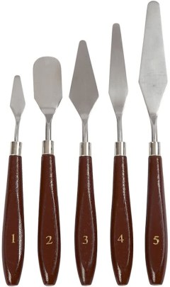 Voor je basisuitrusting raad ik je aan om sowieso 1 ‘broodmes’ formaat paletmes aan te schaffen (bijvoorbeeld nr. 4 of 5 uit de afbeelding) of een goedkope set met verschillende maten. Verf mengen werkt namelijk heel erg goed met een paletmes omdat je er heel goed mee kunt ‘roeren’ en je een paletmes zeer makkelijk kunt reinigen door deze af te vegen aan een doek, waarna je meteen veilig een andere kleur kunt gaan mengen: