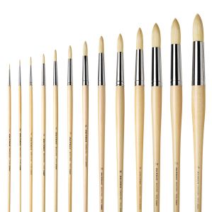 Om een groot bereik van dunne en dikke lijnen/vlakken te kunnen schilderen op een gemiddeld formaat schilderij, raad ik aan om zowel ronde als platte penselen aan te schaffen in tenminste drie formaten; dun, midden en groot.