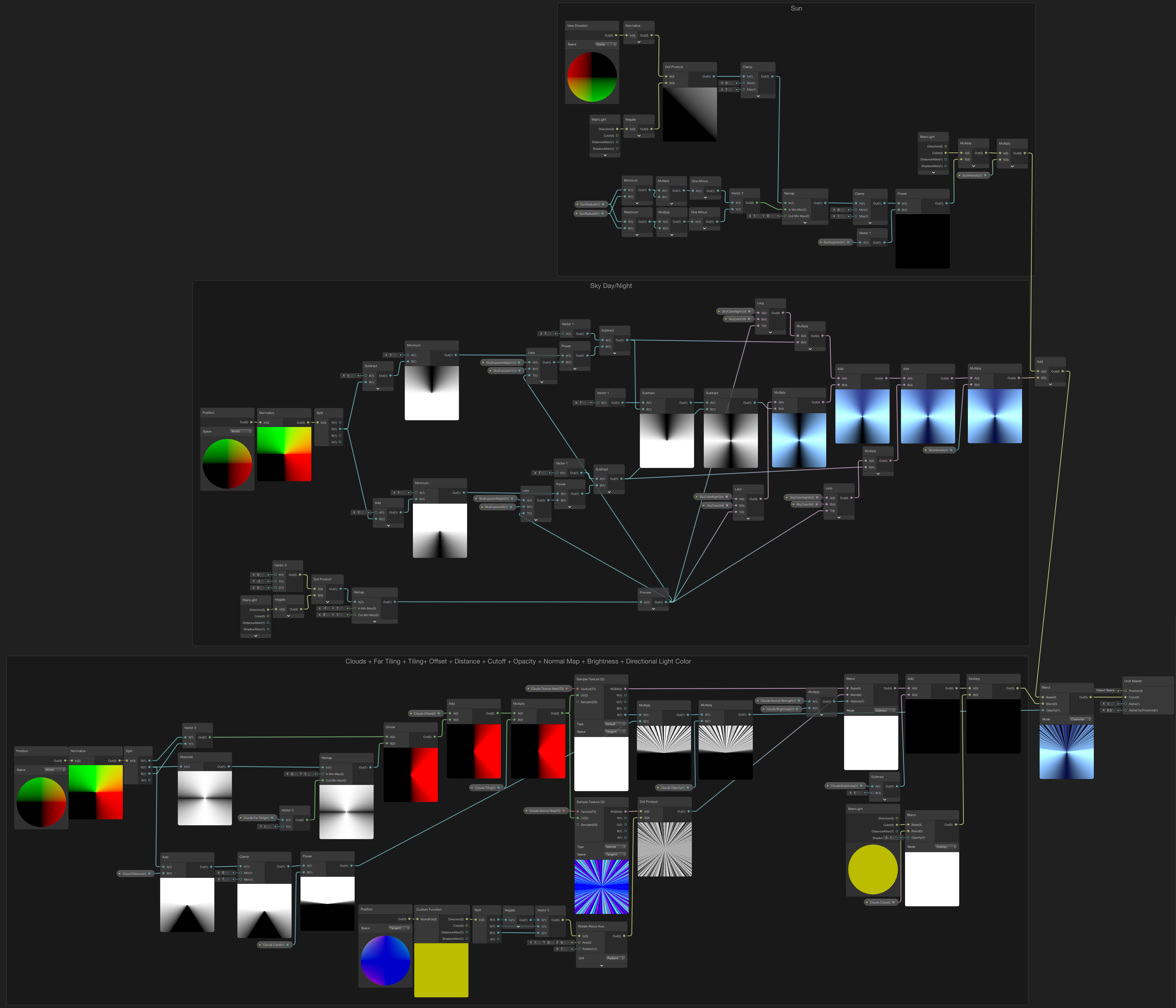 This graph works by getting the dot product from the view direction and the inverse direction of the main light. The size, intensity and softness of the sun can be adjusted with the radius, intensity and exponent variables. The color of the Main Light in the scene is also used to give the sun color.