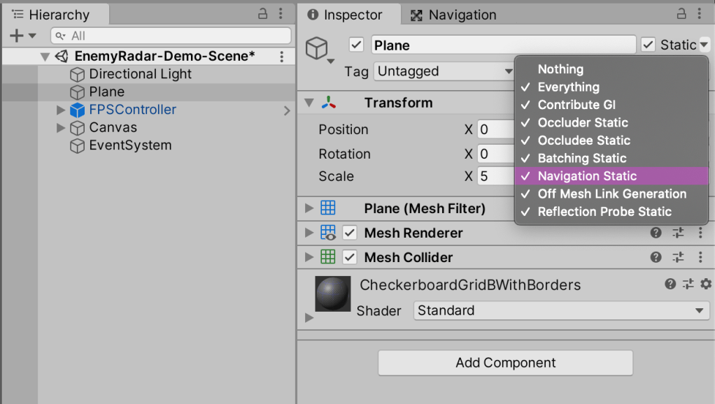 Select the Plane and mark it as navigation static in the Inspector so it will be baked into the NavMesh later on.