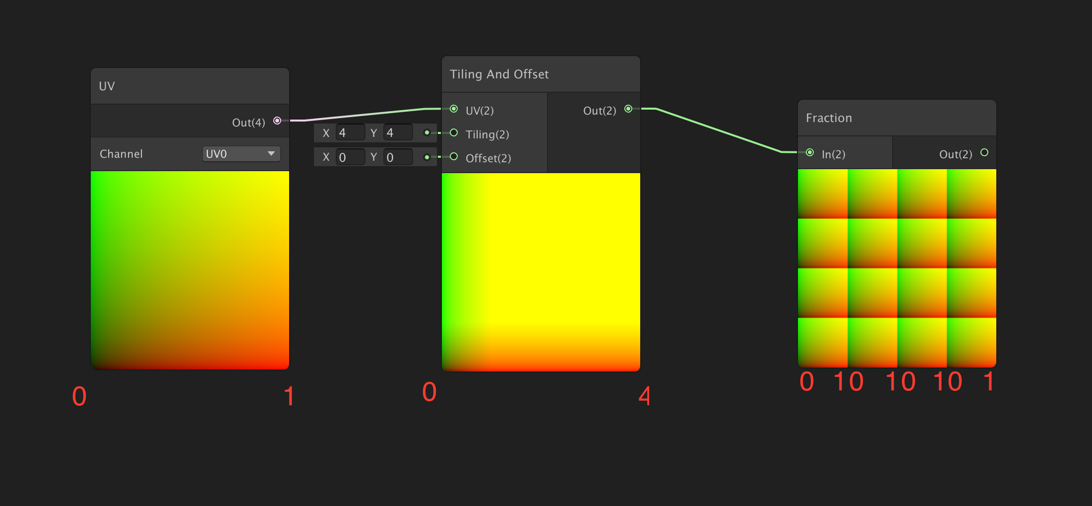 By taking only the fractional component of those coordinates (the numbers after the dot) we get a UV that goes from 0 to 1 four times instead of going from 0 to 4: