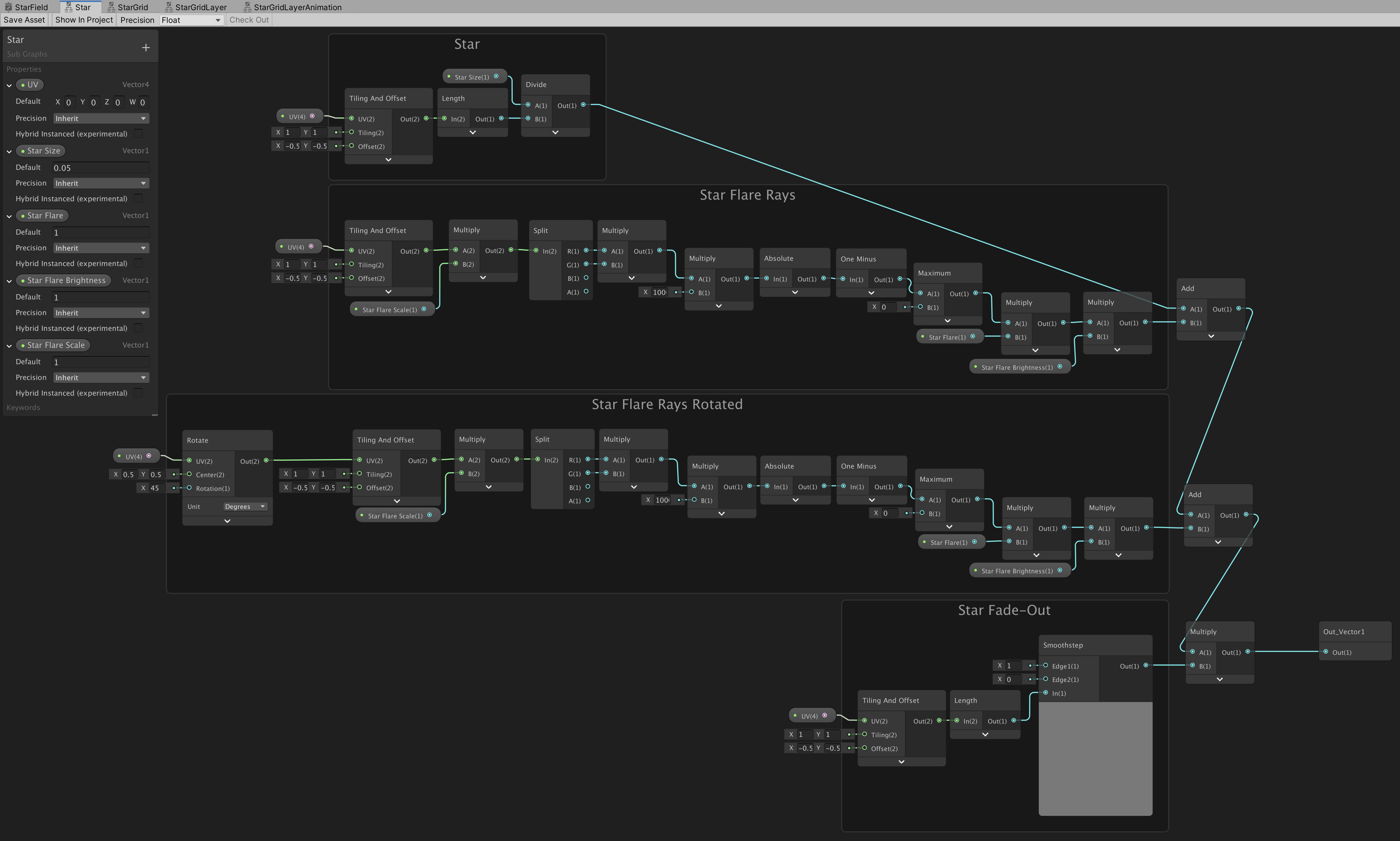 And finally add one more Multiply node and multiply the Offset by a new type Vector1 property called ‘Star Flare Scale‘, so we can control the scale of the flare from the material/Inspector as well: