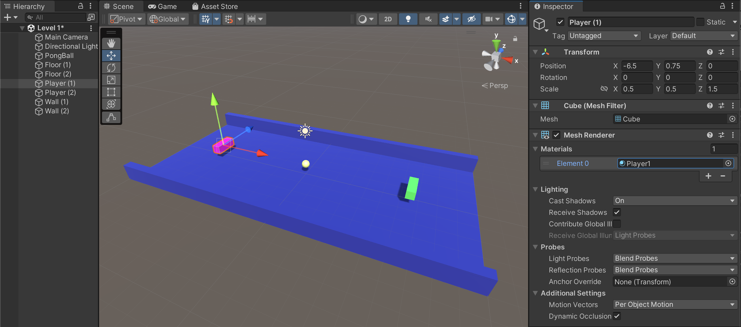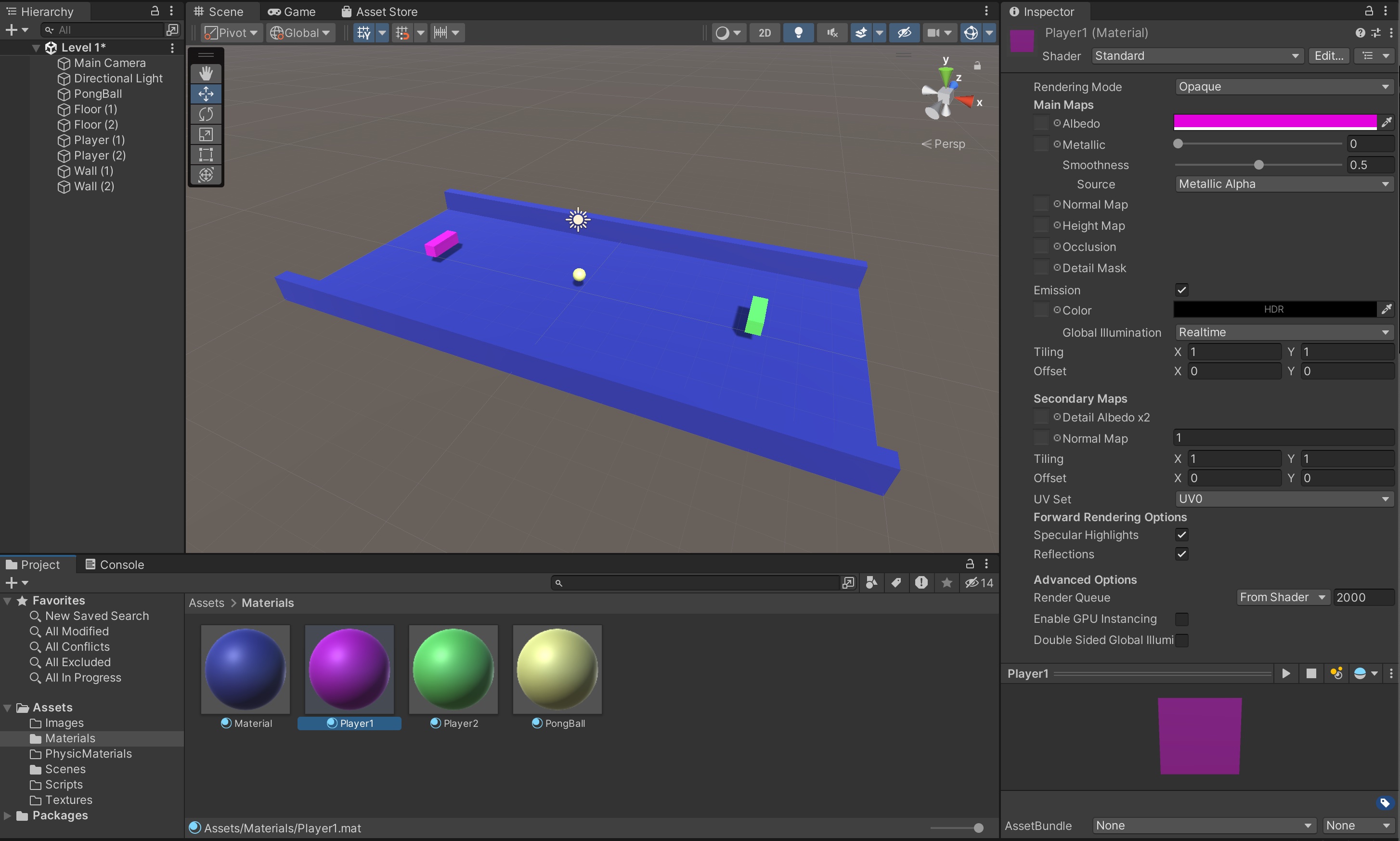 Als je een GameObject in de Hierarchy view of Scene view selecteert, bijvoorbeeld Player (1), kun je zien welk materiaal het GameObject gebruikt.