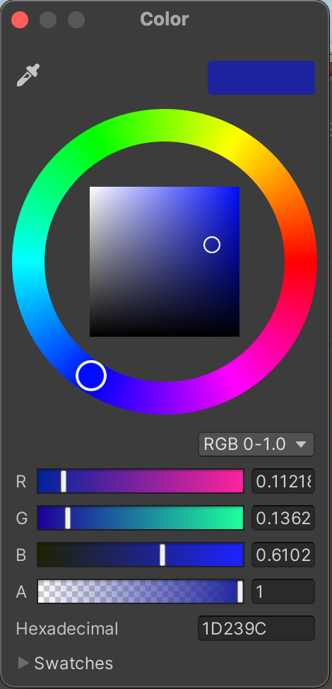 Verander de kleur van het materiaal door op het witte kleur vakje achter ‘Albedo’ te klikken en een kleur te kiezen in het ‘Color’ venster wat opent: