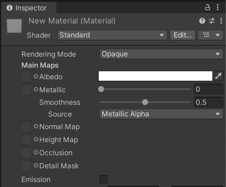 Klik daarna op één van de vier materialen in de Project view zodat je de instellingen ervan te zien krijgt in de Inspector view rechts.