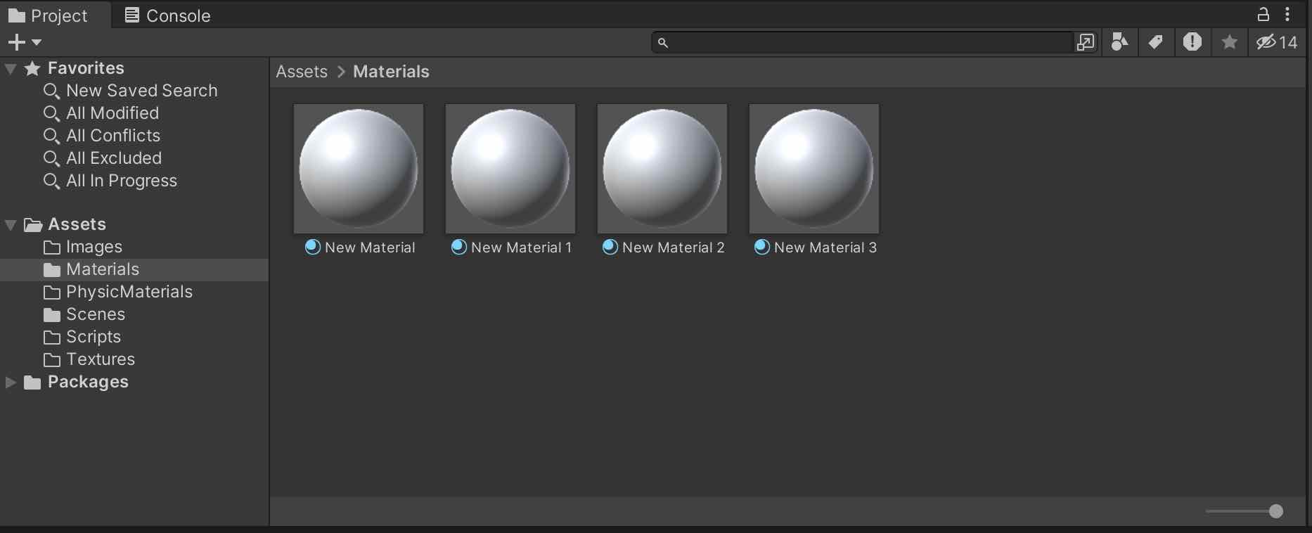 Standaard maken alle objecten gebruik van het Unity default (standaard) materiaal bestand wat in Unity opgeslagen is, je ziet het ‘Default Material’ dus niet terug in je Assets map. Maar je kan heel gemakkelijk zelf veel interessantere materialen maken op dezelfde manier als het stuiter Physic Material van de UnityBasics tutorial, maar dan een gewoon visueel Material in plaats van een Physic Material.