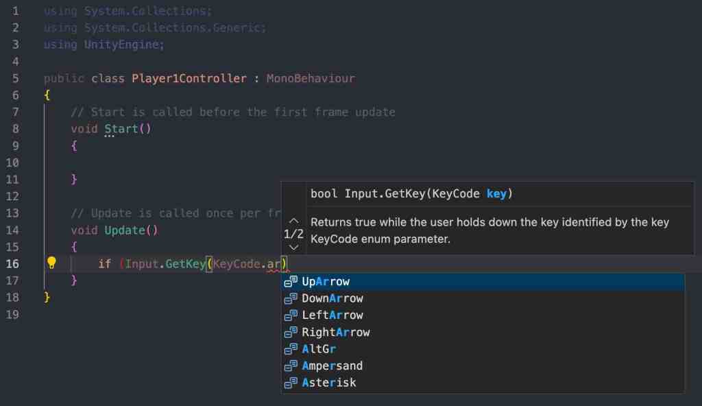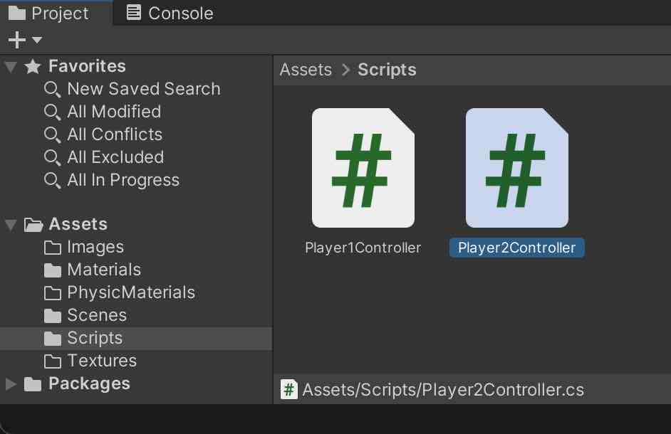 Verander de naam van het gedupliceerde script in ‘Player2Controller’ en dubbelkik erop om het script te openen en weer naar Visual Studio over te schakelen: