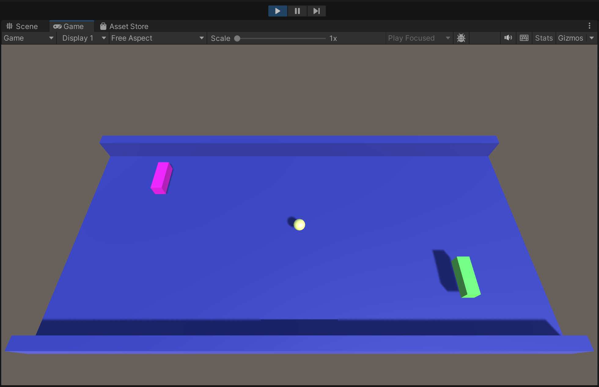 knop om te testen of allebei de spelers bewegen als je op de W, S, en omhoog/omlaag pijltjes toetsen drukt. Unity zal automatisch overschakelen naar de Game view als je op Play drukt: